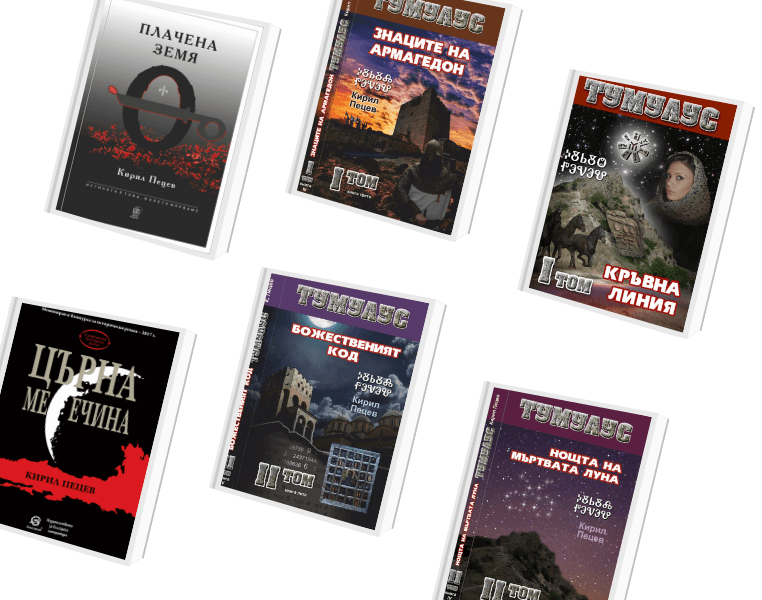 Добре дошли в света на българската историческа белетристика! Кирил Пецев ви кани на завладяващо пътешествие през тайните на миналото и мистериите на настоящето. От древните български корени до съвременните конспиративни теории – неговите романи съчетават достоверни исторически факти с вълнуващи приключения. Открийте за себе си уникалната серия “Тумулус”, романите “Църна месечина” и “Плачена земя”, както и други творби, които ще ви пристрастят към българската литературна традиция.